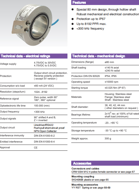 | ○ | 空載電流:≤ 60mA(24 VDC) | ○ | 分辨率(脈沖數(shù)/轉(zhuǎn)): 1024…8192 | |||